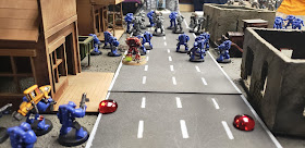 Cute though those tactics were, nothing was going to stop Cheef's hot dice, especially when mine were so, so bitterly cold. The Primaris Vets charged the Tactical Squad in the street, and wiped them out! They consolidated into the Librarian who struck one down with his Force Axe.